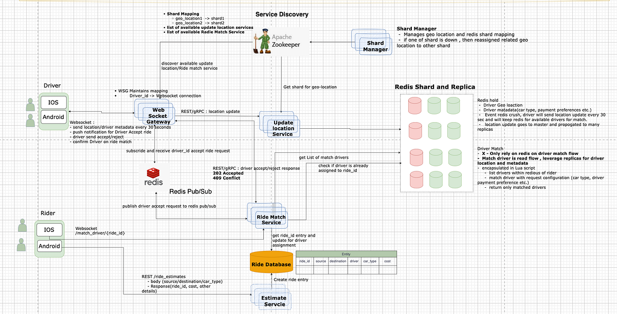 Candidate Selection: Using sharding (e.g., Redis shards for geo-locations), find nearby drivers.