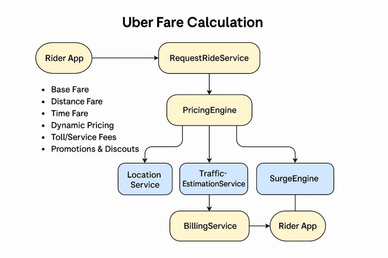 Request a Ride: The rider enters pickup and destination via the app. The system queries nearby drivers using geospatial indexing (e.g., geohashing or quadtrees).